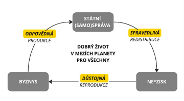Klíčem k dobrému životu v mezích planety pro všechny je rovnováha sil a mezisektorová spolupráce: byznys produkující bohatství, které stát přerozděluje tak, aby ne*zisk (chápáno široce jako jakákoli organizace, jejímž primárním cílem není dosahování zisku) mohl nezištně poskytovat základní služby jako vzdělání či péči, které následně udržují společnost v chodu – a umožňují byznysu fungovat.